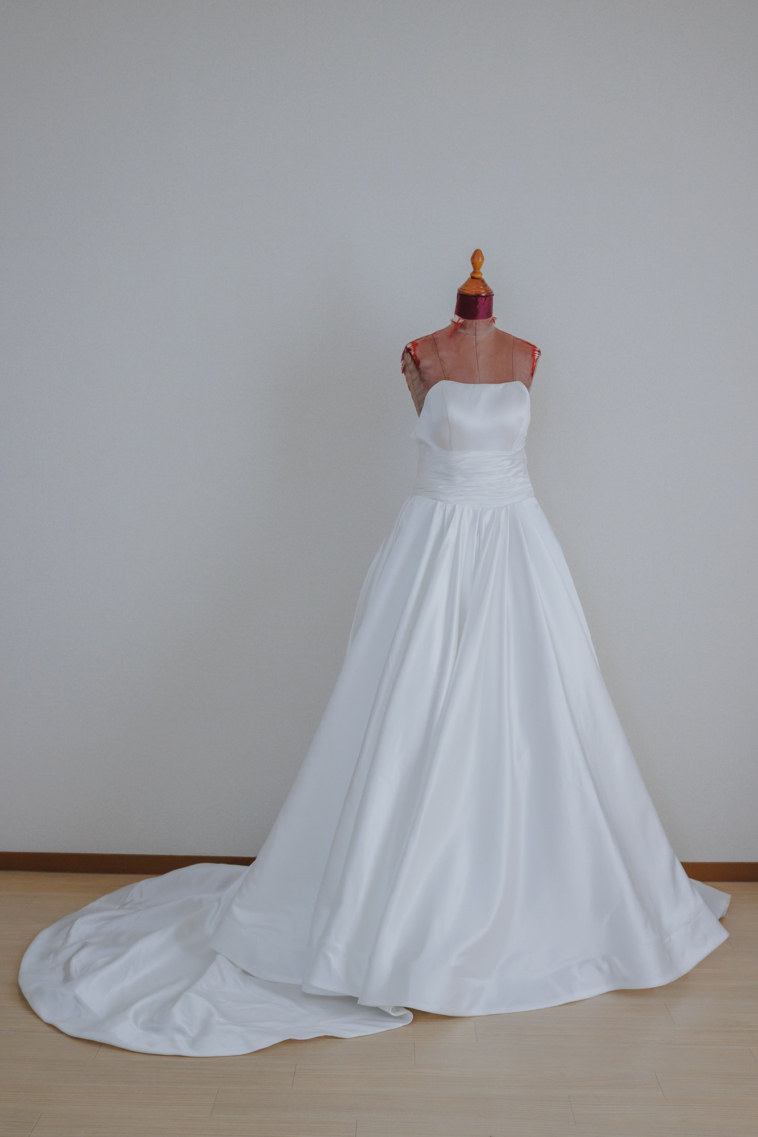 サテン生地の光沢のあるトレーンがやや長めのドレスです.