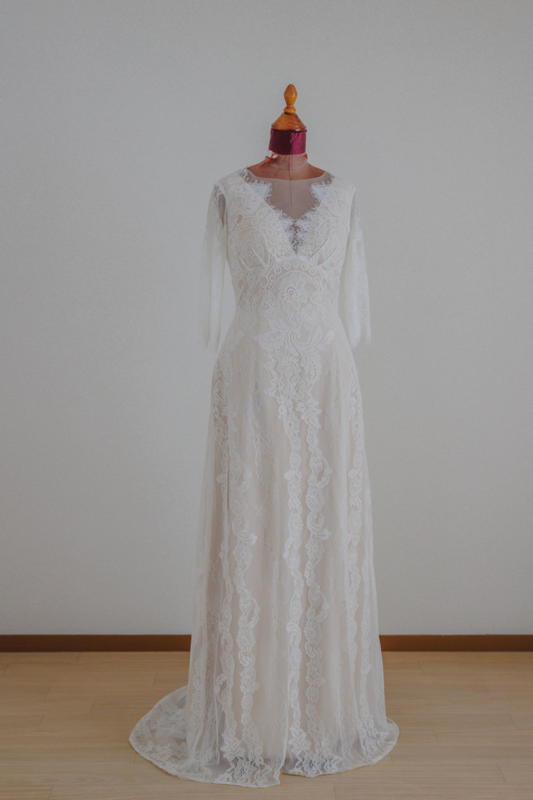 Dress No2206 全体に刺繍の入った背中開きのドレスです。胸元レースの下はV字に切れ込みが入っています.(ヌーブラをご着用ください) サイズ: こちらのドレスはSサイズと Mサイズの2着あります チャック式