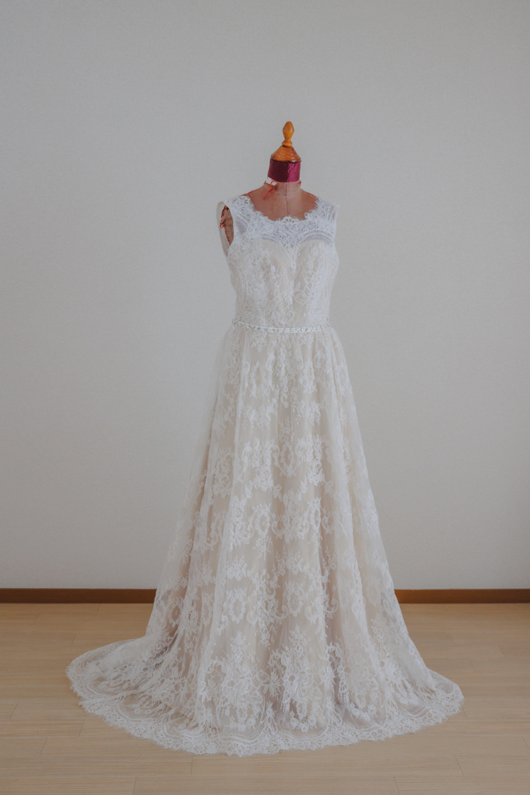 Dress No2207 ノースリーブの総レースのクラシカルフェミニンなドレスです.背中はV字になっておりますが、開きすぎず着やすいデザインになっております.(ヌーブラをご着用ください) サイズ: Mサイズ チャックと一部クルミボタン