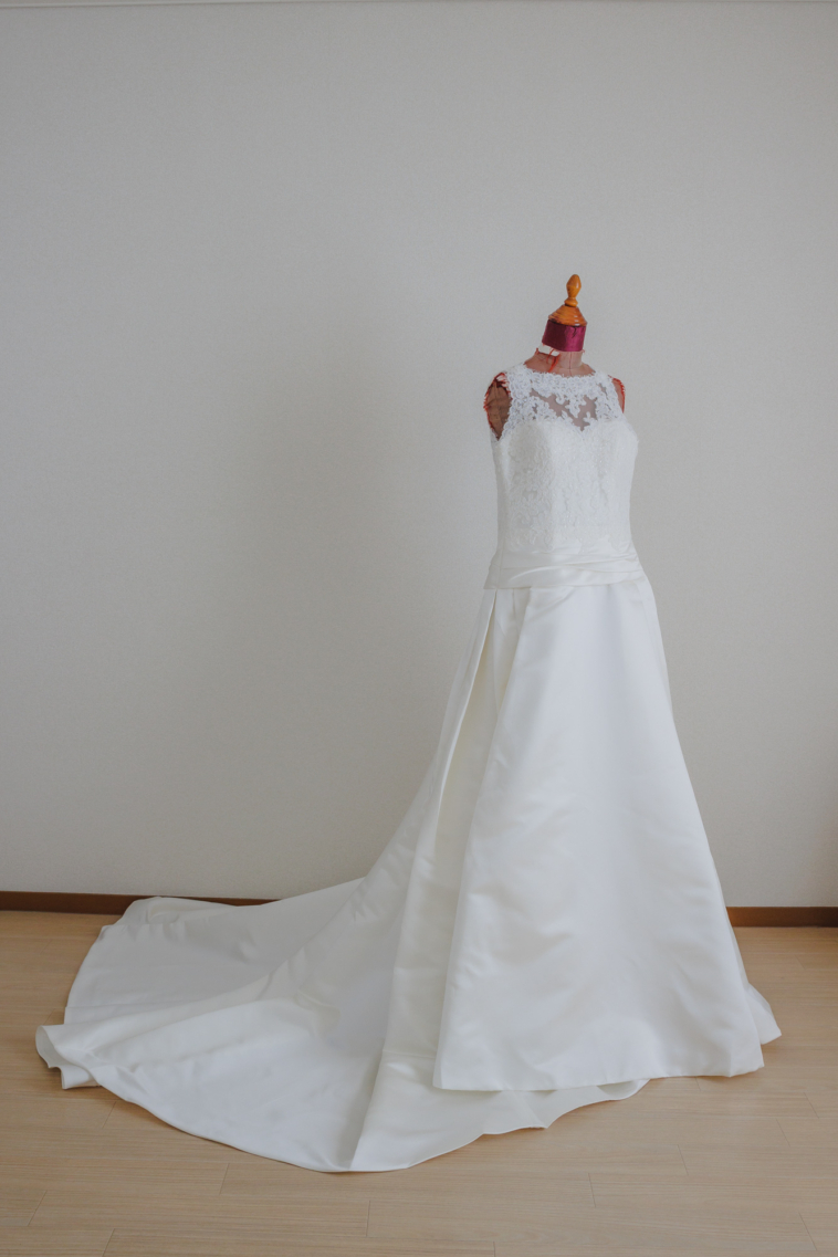 Dress No2209 胸元から背中側に刺繍が施されたドレスです.後ろはチャック式に加え、上部はくるみボタンで留める様式となっております.トレーンが長めで広がりのあるどれすです. ブランド: WHITE ONE(プロノビアス姉妹ブランド) サイズ: 7号