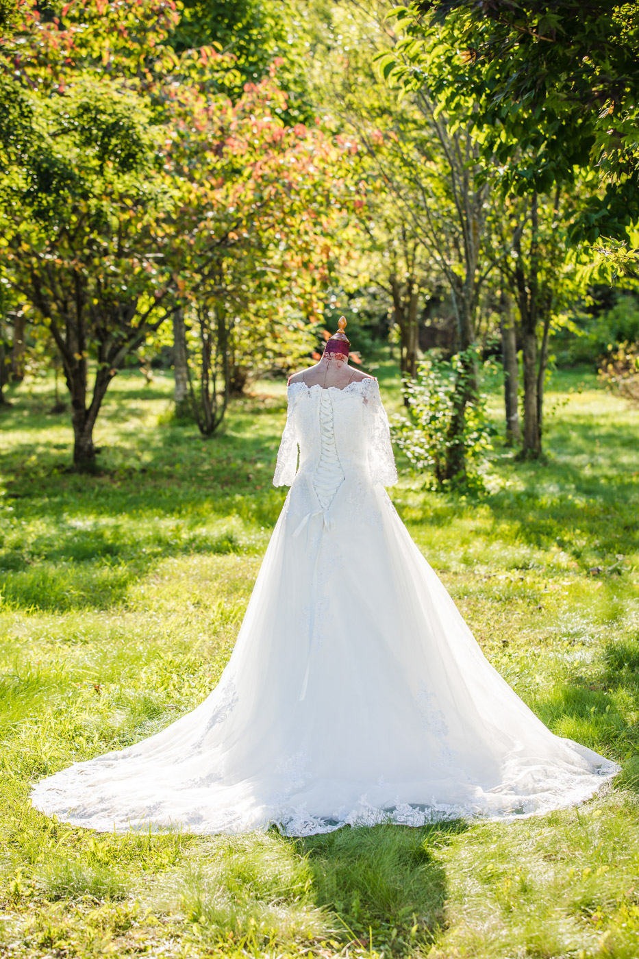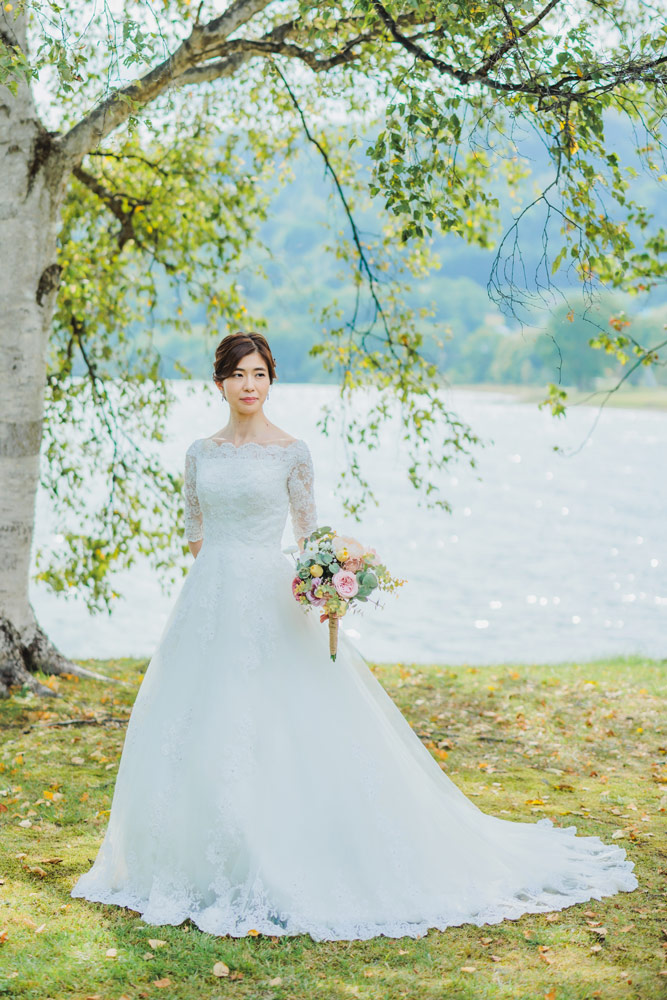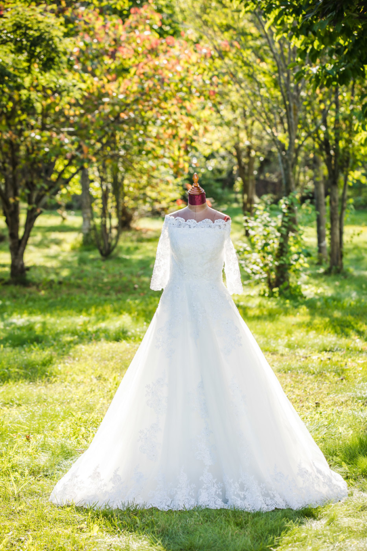 オフショルダードレス。トレーンが長く写真映えするドレスです。